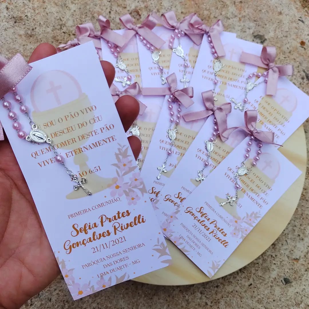 Lembrancinha Primeira Comunhão com terço e cartão personalizado